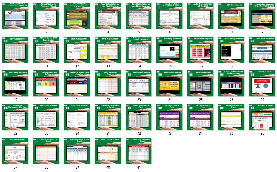 Fully updated calculators from F.Y. 2020-21 to F.Y. 2024-25: Income Tax Calculator (New and Old Tax Regime), HRA Calculator, Form 16 Generation (Old & New Regime), Computation of Income, TDS Data Preparation Sheet, 10E Relief Calculator, Shop Accounting Software, Provident Fund (EPF), NPS, PPF, and Sukanya Samriddhi Yojana Calculators